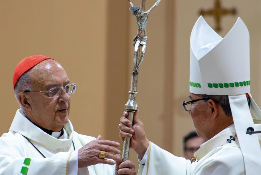 “Este báculo nos acompaña hoy y lo entregamos como signo de comunión. Recordamos que San Pablo VI fue el primer Papa que vino a América Latina, y en sus palabras quedó grabada la expresión: Cristo mira hacia la Amazonía”, señaló el cardenal Rueda y le entregó el báculo.