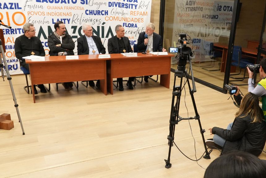 En el Encuentro de Obispos de la Amazonía, se realizó una rueda de prensa en la sede del Consejo Episcopal Latinoamericano y Caribeño (CELAM). En ella participaron el cardenal Leonardo Steiner, arzobispo de Manaos; Mauricio López, vicepresidente de la Conferencia Eclesial de la Amazonía (CEAMA); monseñor Omar Mejía, obispo de Florencia (Colombia); monseñor Lisardo Estrada, secretario general del CELAM; y monseñor Eugenio Coter, vicario apostólico de Pando (Bolivia).
